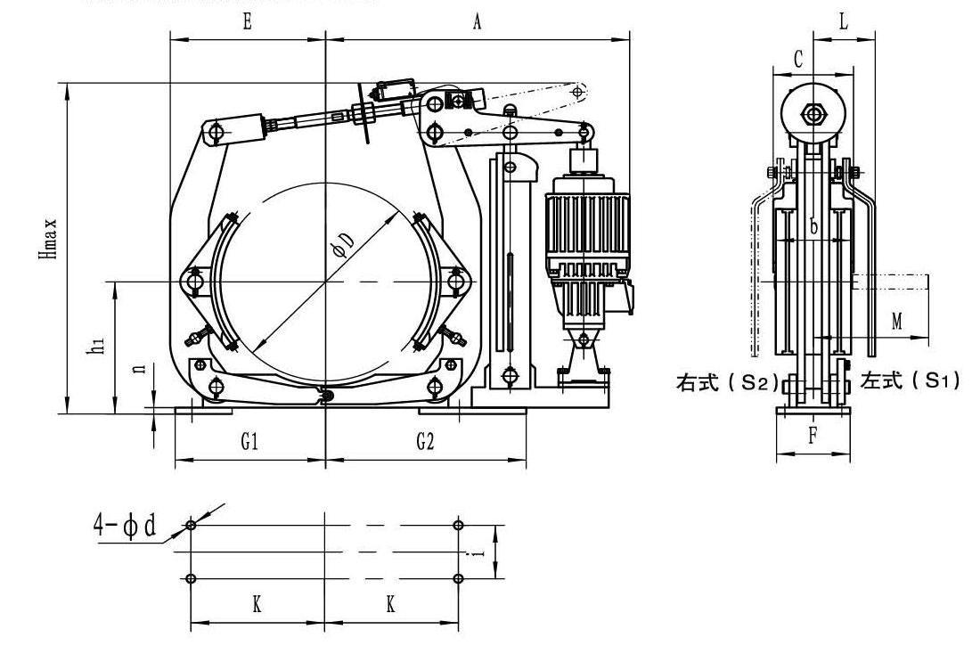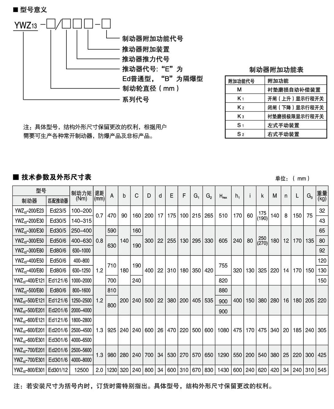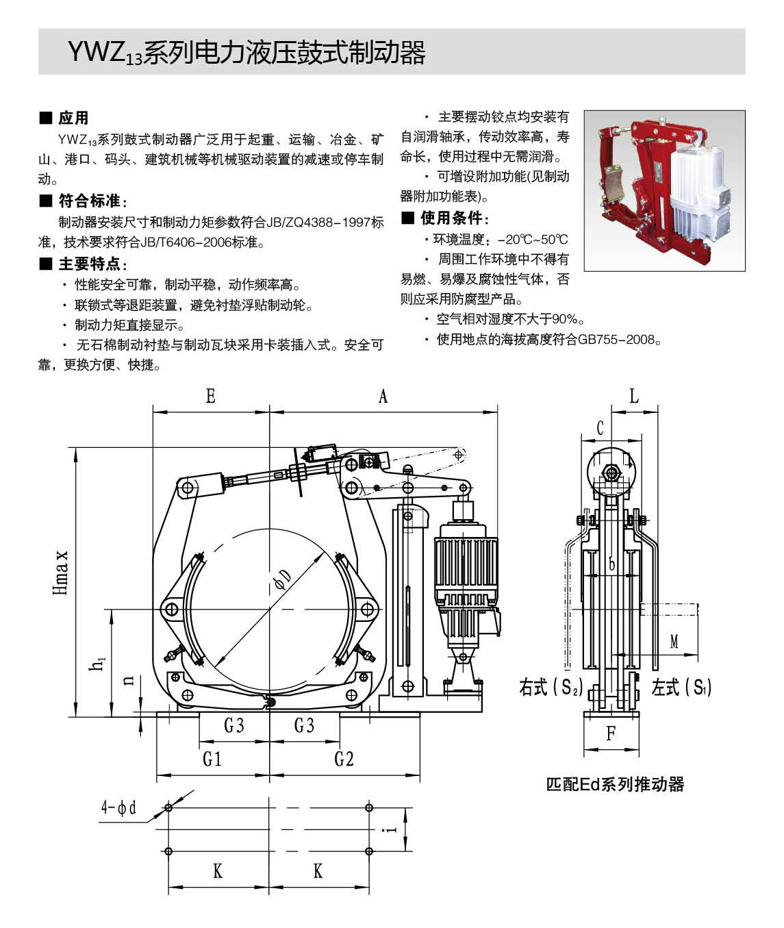 The connection dimensions and technical requirements of YW, YWZ13 series electric hydraulic drum brakes comply with JB/T6406-2006 standard; The braking torque parameters comply with DIN15435 standard and are matched with Ed series thrusters that comply with DIN15430 standard.