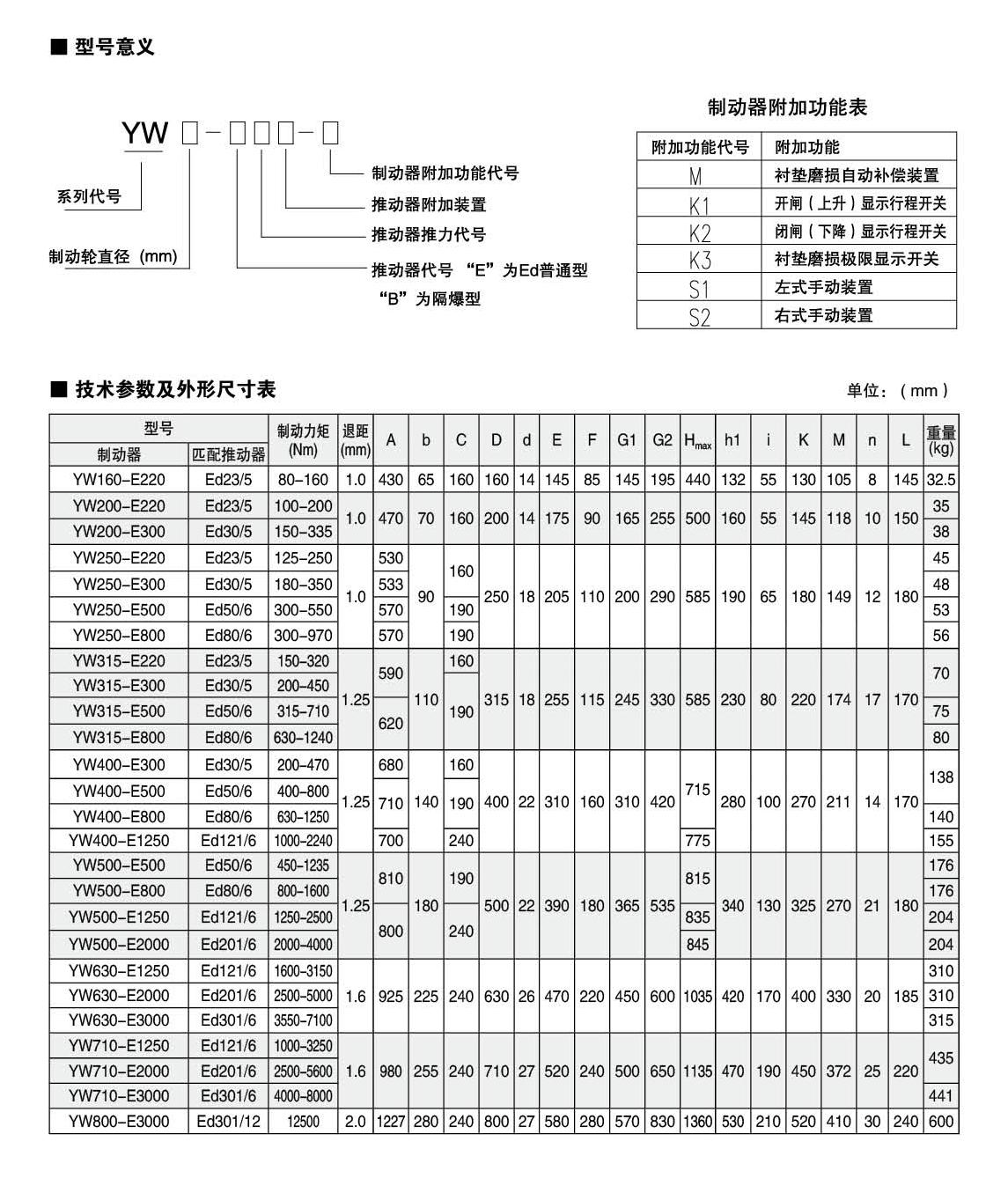 INTRODUCTION:Application:YW, YWZ13 series electric hydraulic drum brakes are widely used for deceleration and parking (maintenance) braking of various mechanisms in lifting and transportation, belt transportation, port loading and unloading, metallurgy, and construction machinery with explosion-proof requirements.Compliance with standards:The connection dimensions and technical requirements of YW, YWZ13 series electric hydraulic drum brakes comply with JB/T6406-2006 standard; The braking torque parameters comply with DIN15435 standard and are matched with Ed series thrusters that comply with DIN15430 standard.Main features:▲ Interlocking type equal clearance device and automatic tile positioning device can always maintain equal clearance of both sides of the tile without adjustment, completely avoiding the phenomenon of one side of the brake pad floating against the brake wheel due to uneven clearance;The main swing hinge points are equipped with self-lubricating bearings, which have high transmission efficiency, long service life, and do not require lubrication during use;The brake spring is arranged inside the square tube and equipped with a ruler, allowing users to easily read the braking torque value, eliminating the hassle of measurement and calculation;▲ The brake pad is a card type integral molding structure, which is very convenient and fast to replace. It is equipped with brake pads of different materials such as semi metal (asbestos free) hard and semi hard, soft (asbestos free), etc. for users to choose from;▲ Equipped with Ed series electric hydraulic thruster products, with sensitive action and long service life;▲ Normally closed design, (power-off) spring brake, (powered on) thruster release.Working conditions:◆ Altitude:<2000m;◆ Environmental temperature: -20 ° C to+40 ° C;Relative humidity: ≤ 90%;Work schedule: intermittent (S3-60%) and continuous (S1);Power supply voltage: three-phase AC, AC380 50Hz (other power levels can be customized as needed);When there are special requirements, they should be negotiated and determined during the ordering process.Basic parameters:Product models: YW-160, YW-200, YW-250, YW-315, YW-400, YW-500, YW-630, YW-710, YW-800Applicable wheel diameter: 160-800mmBraking torque: 80-12500Nm● Product model: YWZ13-200、YWZ13-250、YWZ13-315、YWZ13-400、YWZ13-500、YWZ13-630、YWZ13-710、YWZ13-800Applicable wheel diameter: 200-800mmBraking torque: 80-12500Nm