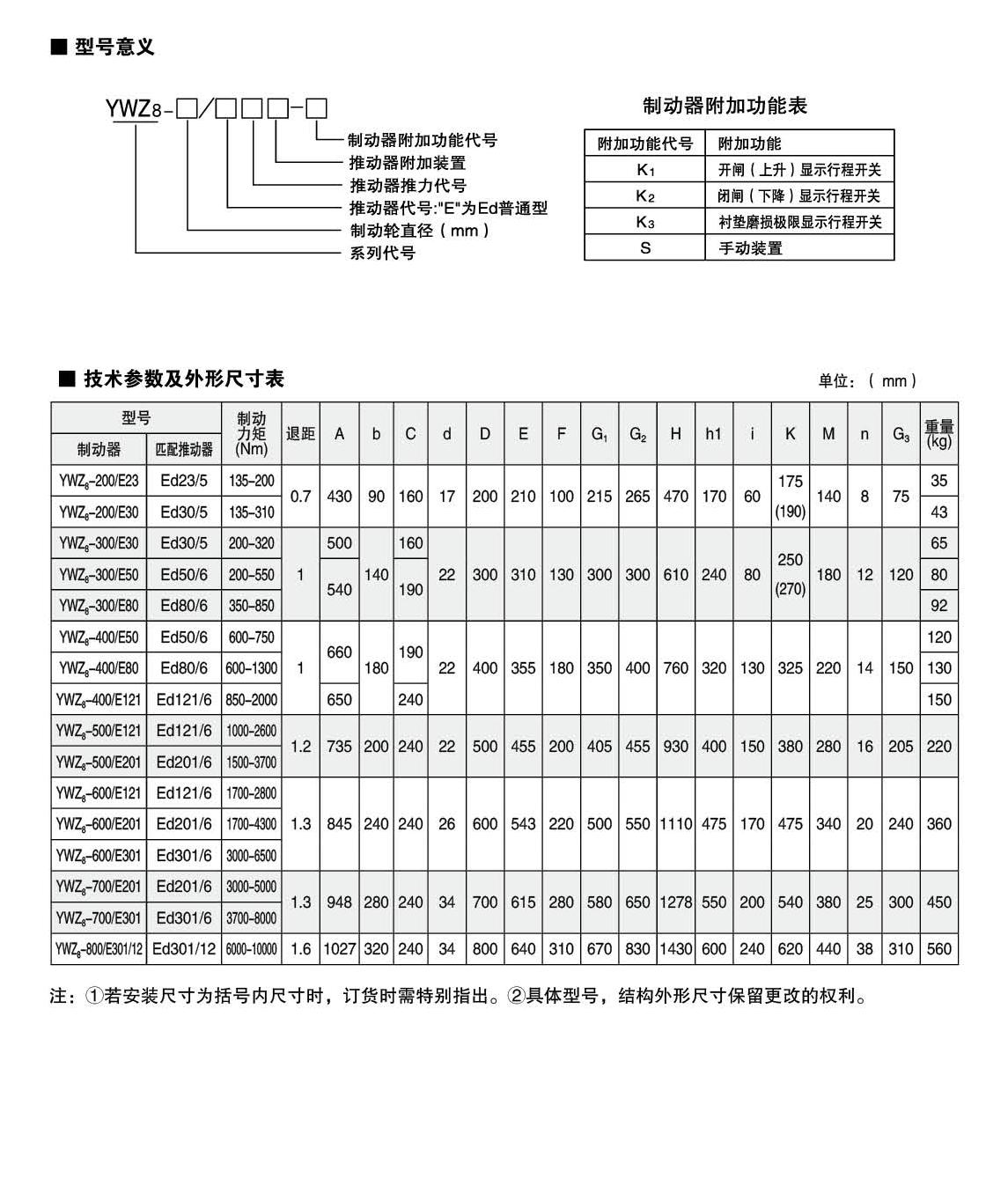 INTRODUCTION:Application:YWZ8, YWP series electric hydraulic drum brakes are widely used for deceleration and parking (maintenance) braking of various mechanisms in lifting and transportation, belt transportation, port loading and unloading, metallurgy, and construction machinery with explosion-proof requirements.Compliance with standards:The connection dimensions and braking torque parameters of YWZ8.YWP series electric hydraulic drum brakes comply with JB/ZQ4388-86 and GB6333-86 (with A series) standards, and the technical requirements comply with JB/T6406-2006 standards. They are matched with Ed series thrusters that comply with DIN15430 standards.Main features:▲ Interlocking type equal clearance device and automatic tile positioning device can always maintain equal clearance of both sides of the tile without adjustment, completely avoiding the phenomenon of one side of the brake pad floating against the brake wheel due to uneven clearance;The main swing hinge points are equipped with self-lubricating bearings, which have high transmission efficiency, long service life, and do not require lubrication during use;The brake spring is arranged inside the square tube and equipped with a ruler, allowing users to easily read the braking torque value, eliminating the hassle of measurement and calculation;▲ The brake pad is a (with card slot) card mounted integral molding structure, which is very convenient and fast to replace. It is equipped with brake pads of different materials such as semi metal (asbestos free) hard and semi hard, soft (asbestos free), etc. for users to choose from;▲ Equipped with Ed series electric hydraulic thruster products, with sensitive action and long service life;▲ Normally closed design, (power-off) spring brake, (powered on) thruster release.Working conditions:◆ Altitude:<2000m;◆ Environmental temperature: -20 ° C to+40 ° C;Relative humidity: ≤ 90%;Work schedule: intermittent (S3-60%) and continuous (S1);Power supply voltage: three-phase AC, AC380 50Hz (other power levels can be customized as needed);When there are special requirements, they should be negotiated and determined during the ordering process.Basic parameters:● Product model: YWZ8-200、YWZ8-250、YWZ8-300、YWZ8-315、YWZ8-400、YWZ8-500、YWZ8-600、YWZ8-630、YWZ8-700、YWZ8-710、YWZ8-800Applicable wheel diameter: 200-800mmBraking torque: 135-10000NmBasic Parameters:Product models: YWP-200, YWP-250, YWP-315, YWP-400, YWP-500, YWP-630, YWP-710, YWP-800Applicable wheel diameter: 200-800mmBraking torque: 80-12500Nm