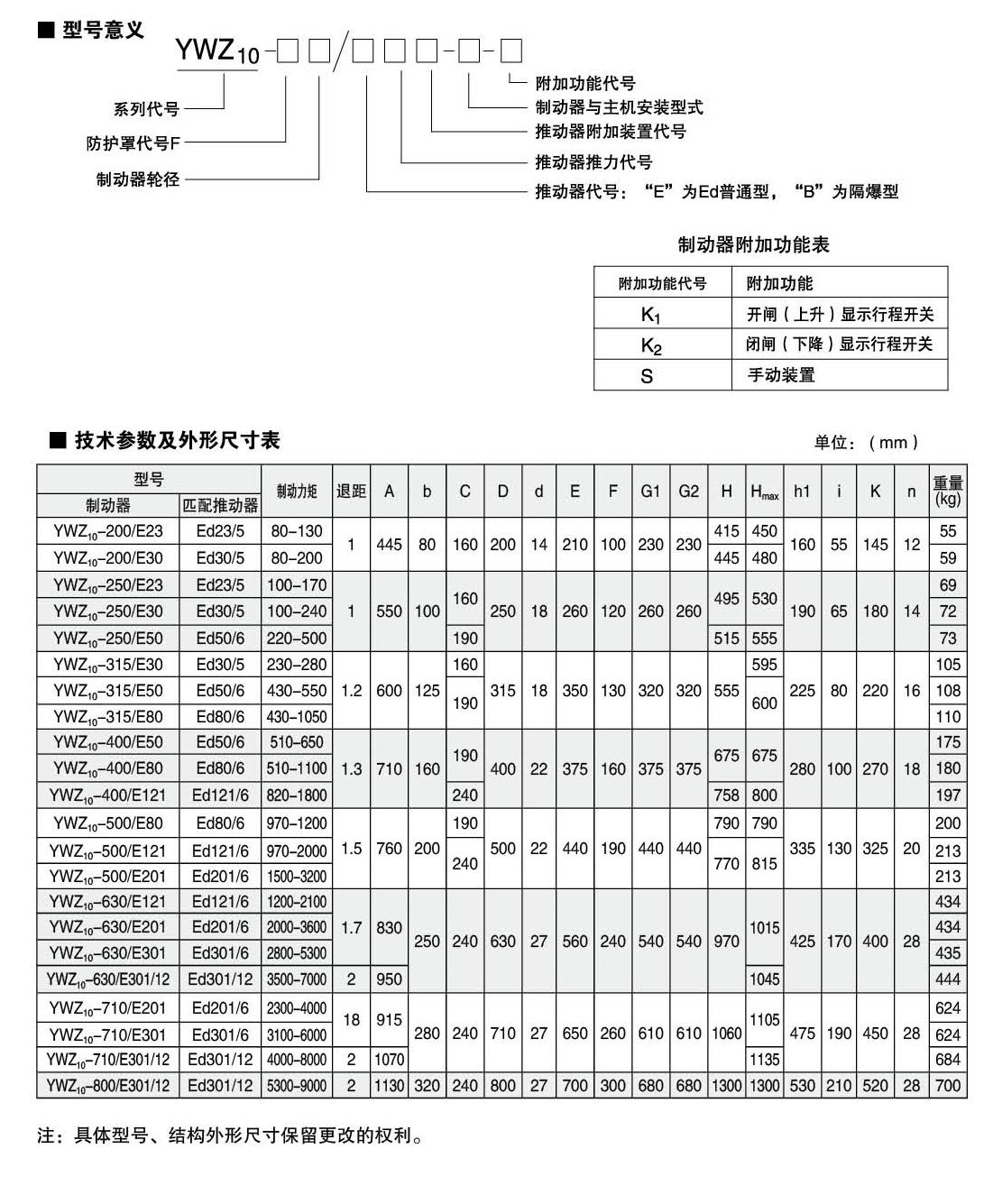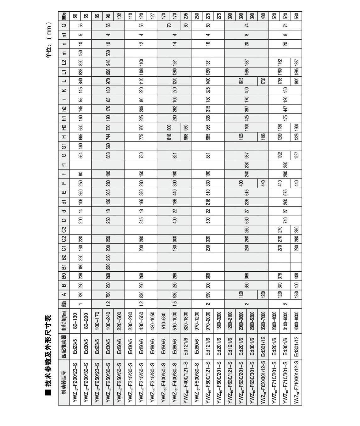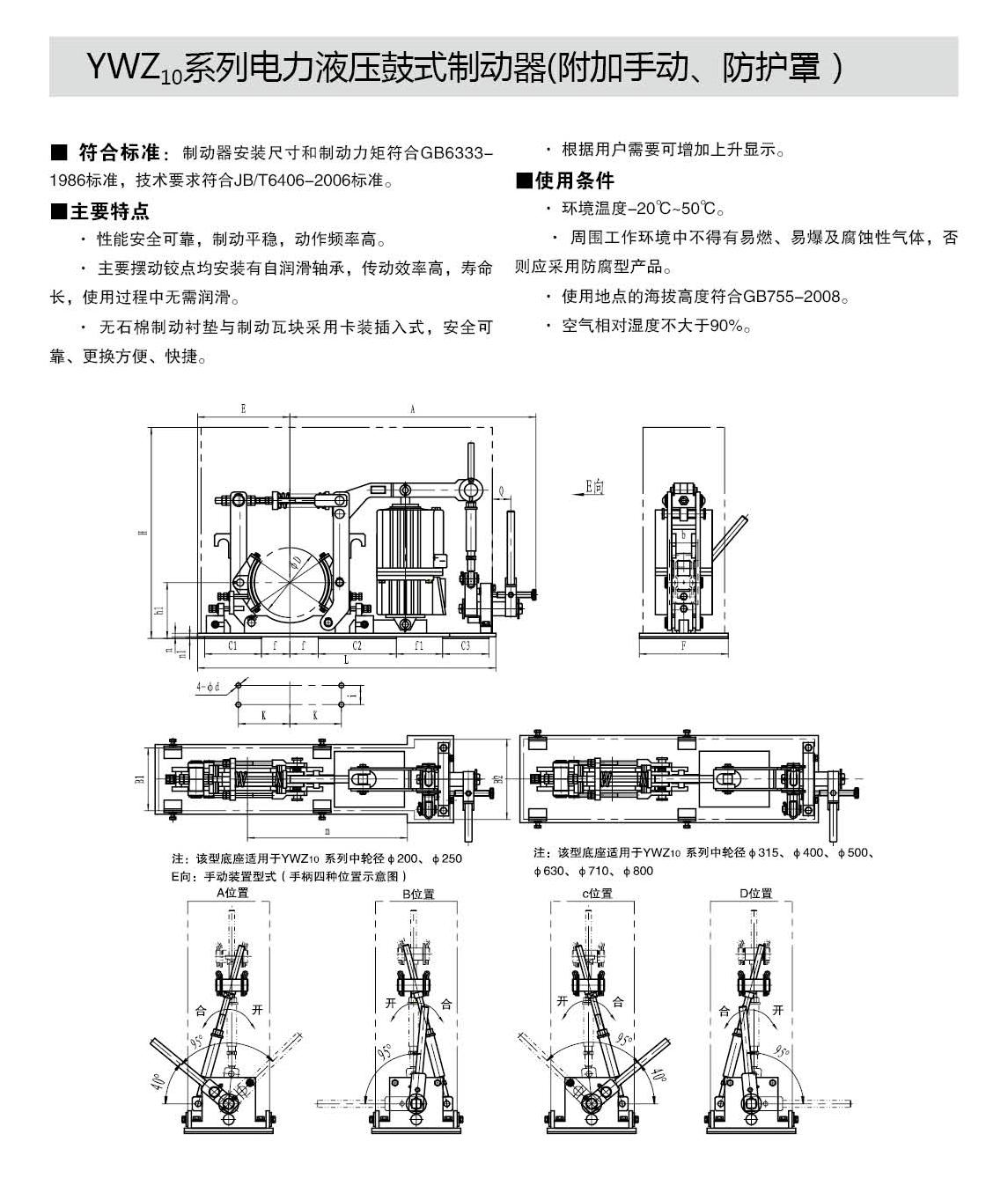 INTRODUCTION:Application:The YWZ10 and YWZ12 series electric hydraulic drum brakes are widely used for deceleration and parking (maintenance) braking of various mechanisms in lifting and transportation, belt transportation, port loading and unloading, metallurgy, and construction machinery with explosion-proof requirements.Compliance with standards:The connection dimensions and braking torque parameters of the YWZ10 and YWZ12 series electric hydraulic drum brakes comply with the GB6333-86 standard, and the technical requirements comply with the JB/T6406-2006 standard. They are matched with Ed series thrusters that comply with the DIN15430 standard.Main features:▲ Interlocking type equal clearance device and automatic tile positioning device can always maintain equal clearance of both sides of the tile without adjustment, completely avoiding the phenomenon of one side of the brake pad floating against the brake wheel due to uneven clearance;The main swing hinge points are equipped with self-lubricating bearings, which have high transmission efficiency, long service life, and do not require lubrication during use;The brake spring is arranged inside the square tube and equipped with a ruler, allowing users to easily read the braking torque value, eliminating the hassle of measurement and calculation;▲ The brake pad is a card type integral molding structure, which is very convenient and fast to replace. It is equipped with brake pads of different materials such as semi metal (asbestos free) hard and semi hard, soft (asbestos free), etc. for users to choose from;▲ Equipped with Ed series electric hydraulic thruster products, with sensitive action and long service life;▲ Normally closed design, (power-off) spring brake, (powered on) thruster release.▲ Front mounted manual, easier to use and maintain.Working conditions:◆ Altitude:<2000m;◆ Environmental temperature: -20 ° C to+40 ° C;Relative humidity: ≤ 90%;Work schedule: intermittent (S3-60%) and continuous (S1);Power supply voltage: three-phase AC, AC380 50Hz (other power levels can be customized as needed);When there are special requirements, they should be negotiated and determined during the ordering process.Basic parameters:● Product model: YWZ10-200、YWZ10-250、YWZ10-315、YWZ10-400、YWZ10-500、YWZ10-630、YWZ10-710、YWZ10-800Applicable wheel diameter: 200-800mmBraking torque: 80-12500Nm● Product model: YWZ12-200、YWZ12-250、YWZ12-315、YWZ12-400、YWZ12-500、YWZ12-630、YWZ12-710、YWZ12-800Applicable wheel diameter: 200-800mmBraking torque: 80-12500Nm
