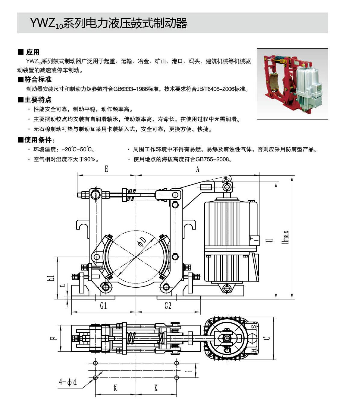 The connection dimensions and braking torque parameters of the YWZ10 and YWZ12 series electric hydraulic drum brakes comply with the GB6333-86 standard, and the technical requirements comply with the JB/T6406-2006 standard. They are matched with Ed series thrusters that comply with the DIN15430 standard.