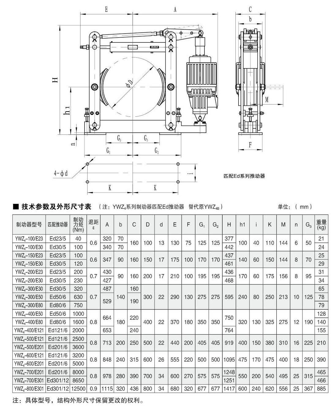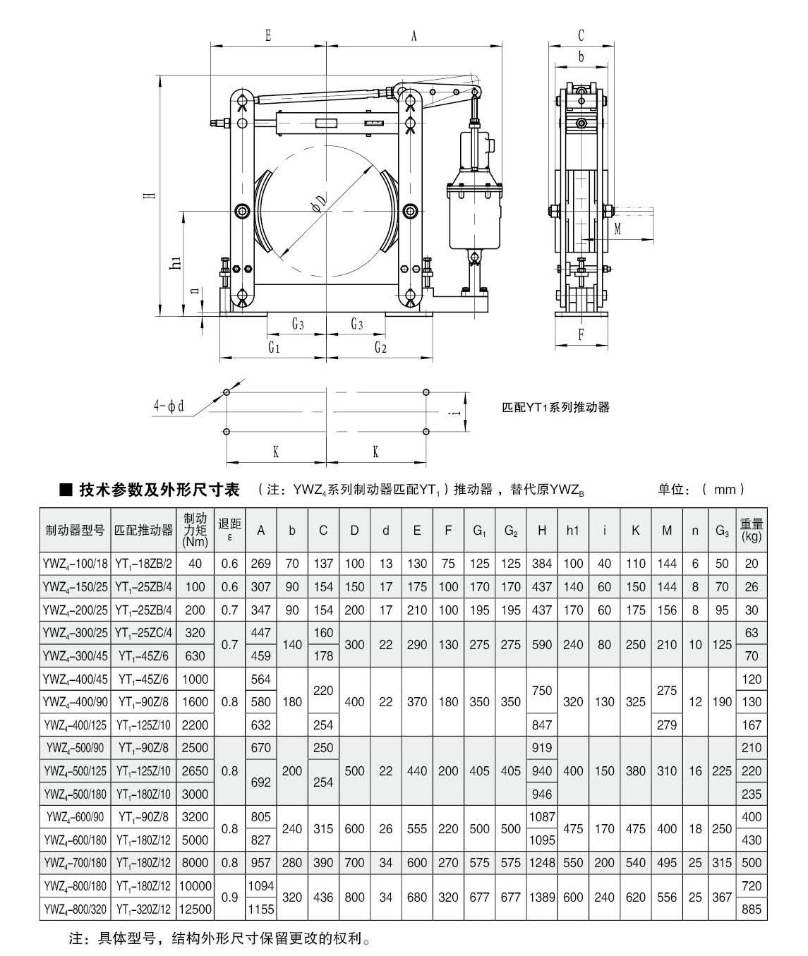 INTRODUCTION:Application:The YWZ4 (YT1) series electric hydraulic drum brake is widely used for deceleration and parking (maintenance) braking of various mechanisms in lifting and transportation, belt transportation, port loading and unloading, metallurgy, and construction machinery with explosion-proof requirements.YWZ4 (Ed) series electric hydraulic drum brakes are widely used for deceleration and parking (maintenance) braking of various mechanisms in lifting and transportation, belt transportation, port loading and unloading, metallurgy, and construction machinery with explosion-proof requirements.Compliance with standards:The connection dimensions and braking torque parameters of the YWZ (YT1) series electric hydraulic drum brake comply with the JB/ZQ4388-86 standard, and the technical requirements comply with the JB/T6406-2006 standard.The connection dimensions and braking torque parameters of the YWZ4 (Ed) series electric hydraulic drum brake comply with the JB/ZQ4388-86 standard, and the technical requirements comply with the JB/T6406-2006 standard.Main features:▲ The production is equipped with riveted brake pads, and if replacement of the card type is required, it should be noted;The main swing hinge points are equipped with self-lubricating bearings, which have high transmission efficiency, long service life, and do not require lubrication during use;▲ Adopting YT1 series electric hydraulic thruster thruster;▲ Normally closed design, (power-off) spring brake, (powered on) thruster release.Working conditions:◆ Altitude:<2000m;◆ Environmental temperature: -20 ° C to+40 ° C;Relative humidity: ≤ 90%;Work schedule: intermittent (S3-60%) and continuous (S1);Power supply voltage: three-phase AC, AC380 50Hz (other power levels can be customized as needed);When there are special requirements, they should be negotiated and determined during the ordering process.Basic parameters:● Product model: YWZ4-100、YWZ4-150、YWZ4-200、YWZ4-300、YWZ4-400、YWZ4-500、YWZ4-600、YWZ4-700、YWZ4-800Applicable wheel diameter: 100-800mmBraking torque: 40-12500Nm